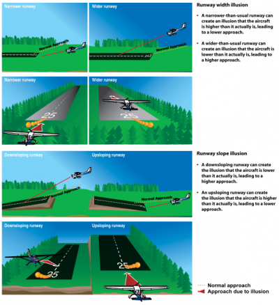 Runway Width Illusion – A narrower-than-usual runway can create an illusion that the aircraft is at a higher altitude than it actually is